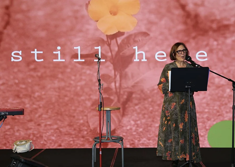 The salon, attended by 175 people, featured storytellers from the Palisades, Altadena and greater Los Angeles area, who shared stories and songs on the theme of “Still Here,” which Katims said “honors the resilient Palisades and Altadena communities.”